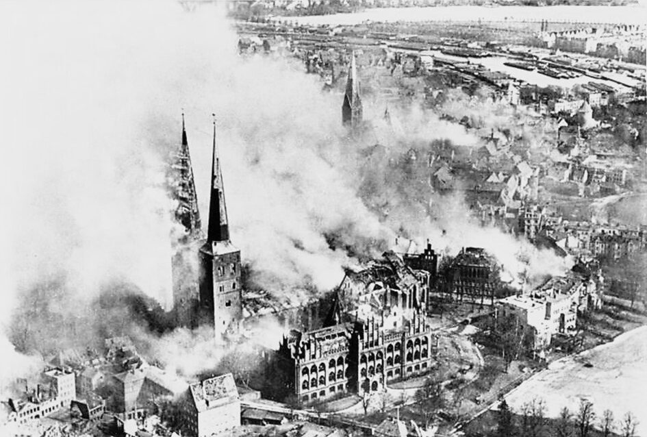 Der Luftangriff der Royal Air Force auf Lübeck am 29. März 1942 war der erste Angriff in Form eines Flächenbombardements auf einen deutschen Großstadtkern durch die Royal Air Force im Zweiten Weltkrieg. Hilde Nordhoff erfuhr am 02. April 1942 von der Bombardierung aus einer Chemnitzer Zeitung „und sah auf der Vorderseite ein Bild von Lübeck, mit der Petrikirche und noch anderen Gebäuden. Die Stadt, das Nürnberg [des] Nordens, so schreibt man, ist vor einigen Tagen einem schlimmen Luftangriff anheim gefallen. Die prächtigsten Kirchen haben große Zerstörungen erlitten. Furchtbar sei es anzuschau[e]n. Ach Du! Welch fürchterlicher Kampf, dieser Luftkampf. Und zu denken, daß nicht nur tausende von Menschen dabei umkommen, sondern auch die wundervollen, alten Baudenkmäler geopfert werden müssen, die doch dann nie mehr in ihrer Schönheit uns grüßen werden; das ist grausam. Zu grausam! Nicht nur die eine Stadt hat derartige Verluste zu beklagen, hundert andre noch! Ich habe sie alle noch, die schönen Postkarten, die Du mir im vergangenen Jahre bei Deinem Aufenthalt in Lübeck schicktest, Alle die bekannten Gebäude sind dabei: Und wenn man denken soll, heute ist all das ein wüster Trümmerhaufen, dann könnte einem eine ohnmächtige Wut packen über das Treiben. Aber – was können wir dagegen tun? Das schreckliche Gericht dieses Krieges vollzieht sich [an] uns wie am Feinde mit grausamer Unentrinnbarkeit.“